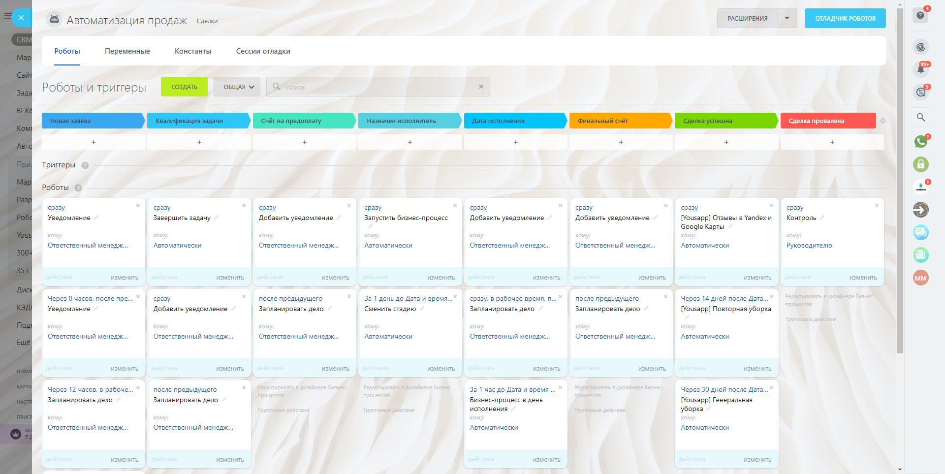 Постановить задачу, запланировать звонок или встречу, сменить ответственного или стадию сделки, отправить письмо или SMS, напомнить ответственному — это лишь часть того, что вы можете настроить с помощью роботов и триггеров в CRM и Задачах.